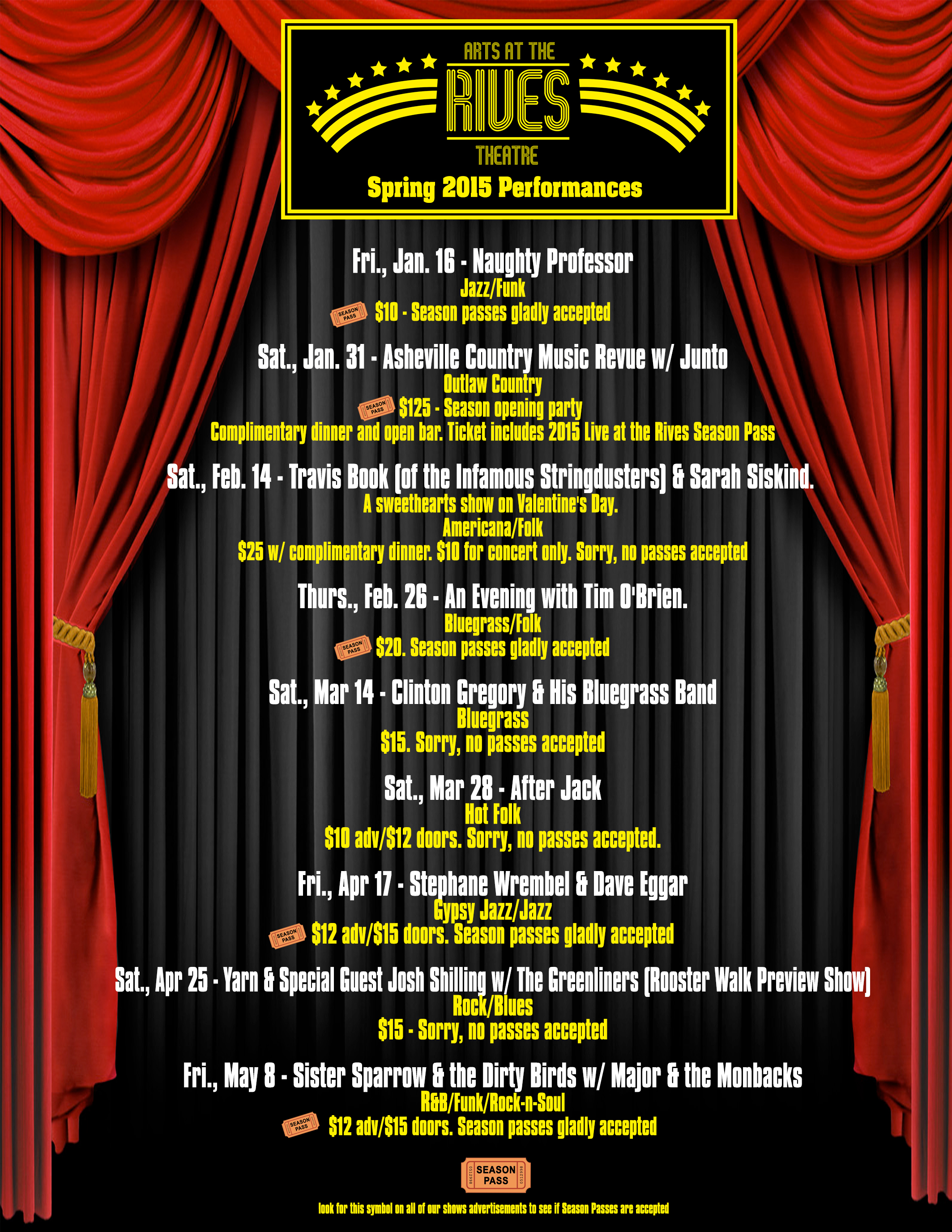 The $125 ticket includes a catered dinner and open liquor bar at the show, plus entry to all six “Live at the Rives Concerts” in 2015.