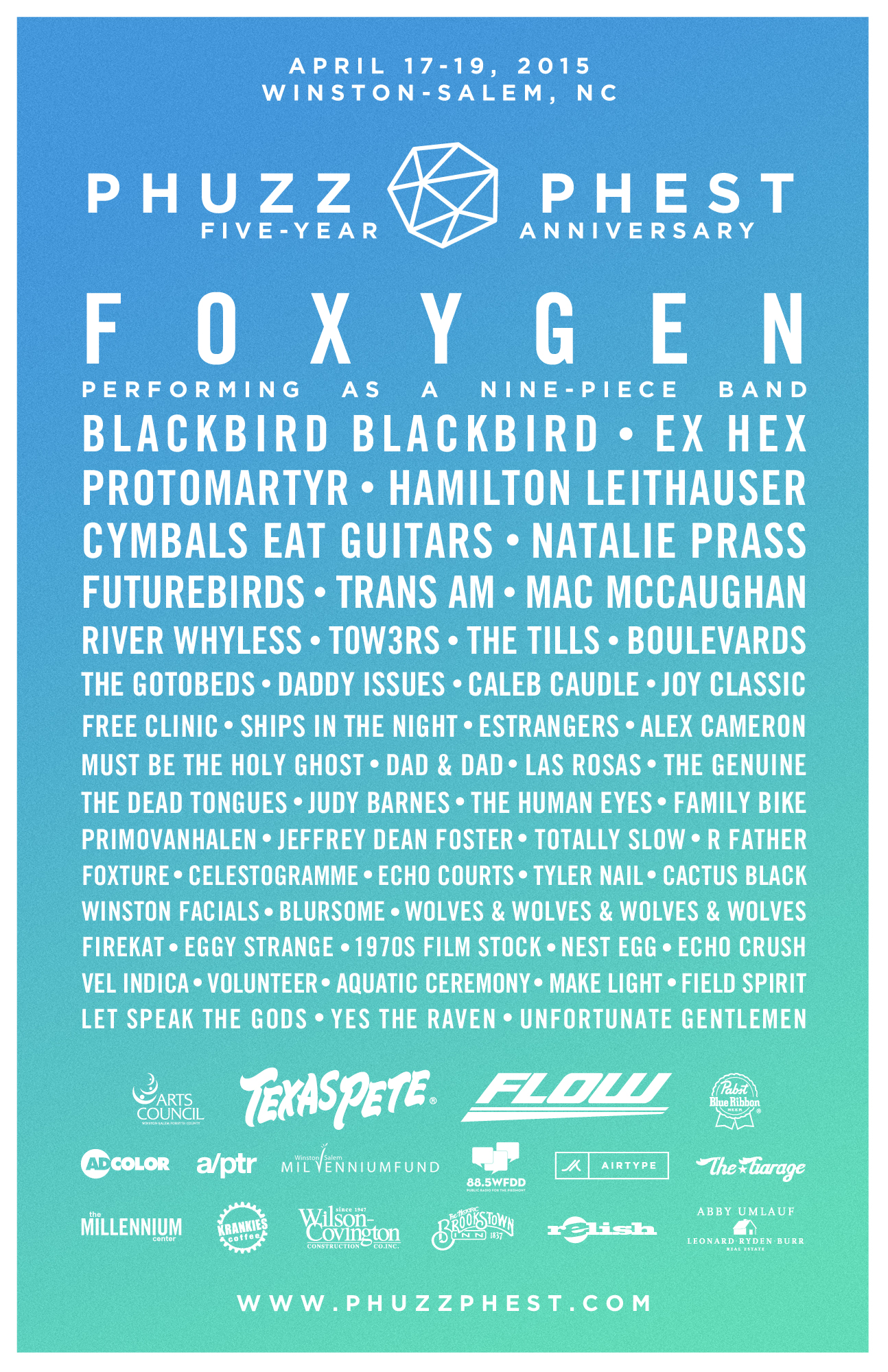 Phuzz Phest headliners include Foxygen, a California band with roots in classic rock and baroque pop, and the 20-plus-year synth metal veterans Trans Am and rockers Protomartyr and Cymbals Eat Guitars. As the festival has grown, so has its offerings of local talent. This year, 25 bands from the Triad will perform including Pledger’s band, Estrangers, and his former bandmate now New Orleans-based artist Caleb Caudle.