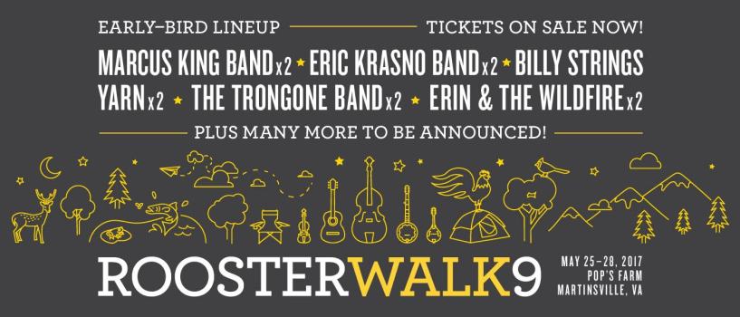 Tickets for Rooster Walk 9 are now available online here. Don’t miss out on early bird tickets at the cheapest prices of the year! Our ninth annual family-friendly festival will take place May 25-28, 2017, at the idyllic Pop’s Farm in Axton, Virginia. For more info, including the early-bird band lineup, visit www.RoosterWalk.com.