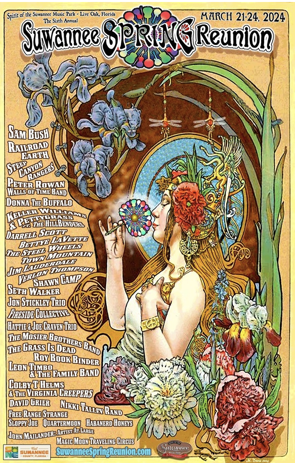 | From the good folks at Suwannee Spring Reunion: Suwannee Spring Reunion takes place Thursday through Sunday, March 21-24 at The Spirit of the Suwannee Music Park (SOSMP) in Live Oak, Florida. Set in the midst of 800 acres of majestic Spanish moss-draped oak and cypress trees along the Suwannee River, this family-friendly festival boasts four days and nights of music rooted in Americana, newgrass, bluegrass, folk, blues, and more. Featuring music on multiple stages, with many repeat performers throughout the weekend, we are happy to announce the schedule for the 2024 edition of the festival! “Suwannee Music Park in Live Oak, Florida, would seem the most unlikely of bluegrass epicenters, but legends and new stars alike flock there every spring for an in-the-know festival,” wrote Rolling Stone. This stellar lineup promises an exciting start to the long weekend’s festivities with Keller Williams’ PettyGrass ft. The HillBenders headlining Thursday night—bringing bluegrass versions of Tom Petty Hits; get ready to sing along at SOSMP’s gorgeous Amphitheater Stage. Prior to PettyGrass the Amphitheater Stage are The Steels Wheels, who are rolling into Florida with a brand new album, Sideways, in hand— they also perform in the Music Hall later that night. Alt-country honky-tonk rebels Town Mountain (also bringing a fresh new release: Dance Me Down Easy: The Woodstock Sessions EP), will close out the night on the Amp Stage with their first set of the weekend (Thu/Fri). Over on the Porch Stage on Thursday we see the first sets of the weekend from Country-soul rocker Leon Timbo & The Family Band (Thu/Fri), the soul-folk of Hattie & Joe Craven Trio (Thur/Fri/Sat), and the first set from The Grass is Dead (Thu/Sun). Sloppy Joe opens the festival at 4pm on the Amphitheater stage and can also be heard throughout the weekend on various stages and in the campground at their own, open call, pickin’ party site—Slopryland. Before the legendary Sam Bush takes center stage on Friday night, Americana blues icon Bettye Lavette makes her stage debut at the Park on the Amphitheater Stage. With their first set of the weekend, Railroad Earth (Fri/Sat) closes up the late night on the Amp Stage. In the midst of all that goodness on Friday—and in between the aforementioned sets—over on The Porch Stage will be Darrell Scott (also playing Sat), Town Mountain, and the first of a few sets from roots rockin’ troubadours Donna the Buffalo (Fri/Sat/Sun). Saturday night is a double dose with Railroad Earth returning The Amp Stage, preceded by what is sure to be a soul-stirring set of mountain music by Steep Canyon Rangers. Donna the Buffalo is sure to keep everybody dancing to the wee hours, closing the stage late-night. Saturday on the Porch Stage we see the first sets of the weekend by Peter Rowan & The Walls of Time Band (Peter Rowan, Chris Henry, David Mansfield III, David Grier, Mike Bub, Larry Atamanuik); and The Mosier Brothers Band (featuring Jeff Mosier’s Scruggs’-style banjo prowess and Johnny Mosier’s rockin guitar chops, founders of Blueground Undergrass—a former Suwannee staple act (Fri/Sat/Sun)). Also on the Porch on Saturday is rising bluegrass star Colby T Helms & The Virginia Creepers. Currently on tour with a new album: Tales of Misfortune, Helms makes his Suwannee debut Friday in the Dance Tent. Sunday, dubbed “Vassar Sunday” by regular attendees and staff, is a musical day of gathering, celebration, and rememberance of those who came and played before (Vassar Clements, Sue Cunninham, Guy Clark, Col. Bruce Hampton, just to name a few) and those who carry on the traditions of what started at the park way back in 1997. Fueled with anticipation, Donna the Buffalo will close out the evening with a special set—bringing up to the stage just about every artist who is left at the fest. Other performances that day leading into the finale include Jim Lauderdale, Verlon Thompson, The Mosier Brothers, and Peter Rowan & The Walls of Time Band. The weekend is jam-packed with multiple sets by many at all of the festival stages (Amphitheater Stage, Porch Stage, Dance Tent Stage, Music Hall, & Music Farmers Stage) Along with some of those mentioned above, there will be multiple sets by Jim Lauderdale (Sat/Sun), Verlon Thompson (Fri/Sat/Sun), Roy Book Binder (Fri/Sat), Shawn Camp (Fri/Sat), Seth Walker (Fri/Sat), Jon Stickley Trio (Fri/Sat), Fireside Collective (Fri/Sat), David Grier (Fri), Nikki Talley Band (Thu, Sun), Free Range Strange (Sat), Habanero Honeys (Sat), Quartermoon (Fri/Sat and throughout the weekend hosting campground pickin’ at the Bill Monroe Shrine), John Mailander: Artist-at-Large through the weekend, and Magic Moon Traveling Circus. Something special to note about the lineup is that it includes artists with storied histories of epic Suwannee performances over the years. Matching the history on the stage, longtime park hosts, Randy and Beth Judy, are partnered with the Spirit of the Suwannee to make sure that every piece needed to make an epic weekend. It is home to generations of families who have gathered year after year to experience that shared connection to the music and the commitment to the notion of something bigger than ourselves. Festival Director Beth Judy says “From the very beginning, in 1997, with our first festival at SOSMP (SpringFest), we set an intention of a community of love and healing and music and positive impact on the lives of the people who were there. And we attracted those people who needed that in their lives, and many of them are still coming. The Suwannee Spring Reunion is a new version of the events we began so long ago when music festivals were just starting to pop up again after Jerry’s passing. SpringFest and MagFest had changed and evolved over the years and now we are gathering everyone together for the big reunion and revival of what commenced during those early years.” “There’s this unique, communal spirit here, where