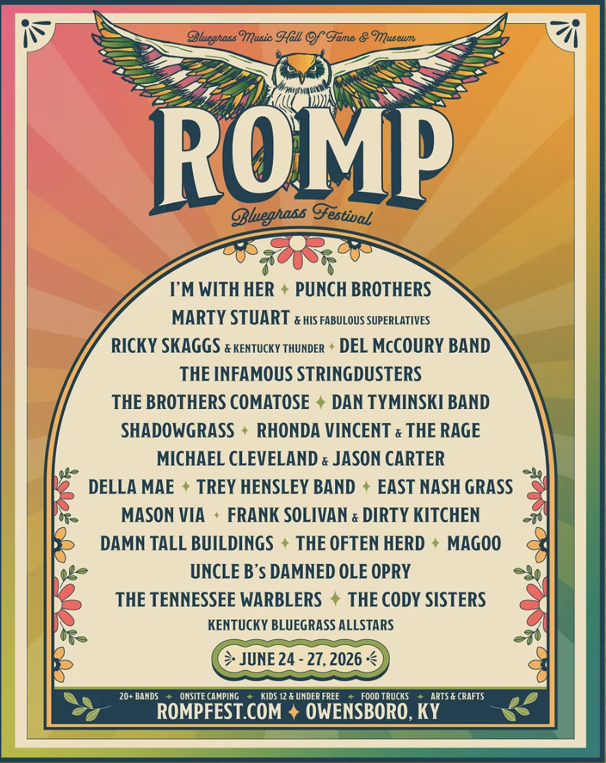 ROMP Festival 2026 is an annual bluegrass & roots music celebration set for June 24-27 in Owensboro, Kentucky. Hosted by the Bluegrass Music Hall of Fame & Museum, the festival is renowned for its vibrant community atmosphere, exceptional music lineup, and dedication to preserving the rich legacy of bluegrass music.