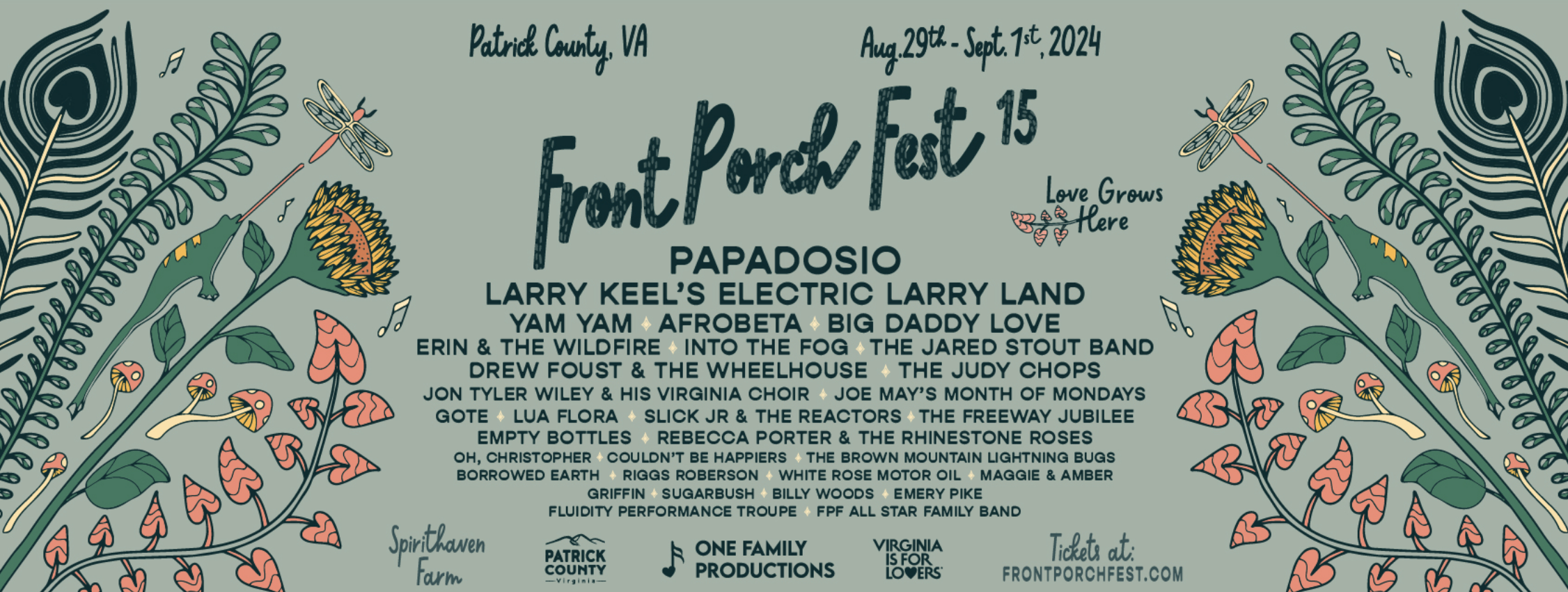 Labor Day weekend 2024 marks the 15th annual Front Porch Fest, held on the Front Porch of the Blue Ridge Mountains in Patrick County, Virginia. The festival will take place Aug. 29 – Sept. 1, 2024, at Spirithaven Farm and musical acts include Larry Keel’s Electric Larry Land, Yam Yam, Afrobeta, Big Daddy Love, Erin & the Wildfire, Into the Fog and The Judy Chops.