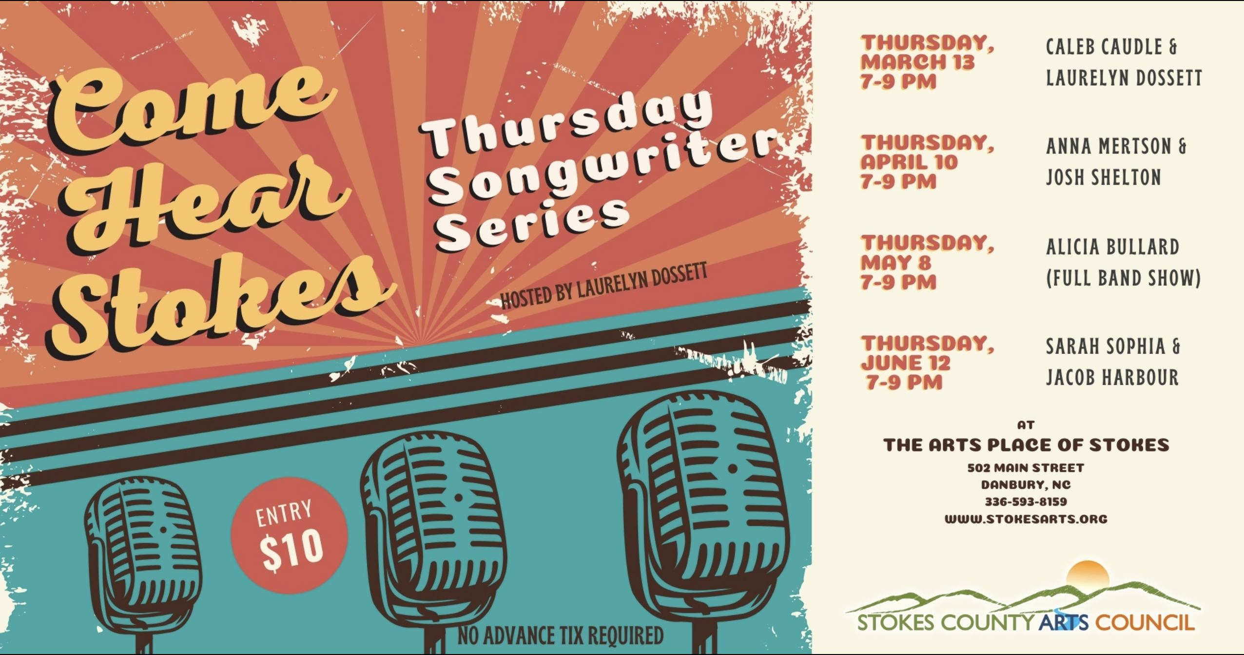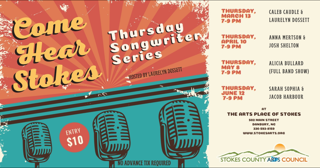 The Stokes County Arts Council, 500 N. Main Street, Danbury, North Carolina, is hosting Come Hear Stokes Thursday Songwriter Series hosted by Laurelyn Dossett. Tickets are $10 at the door.