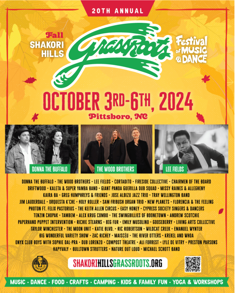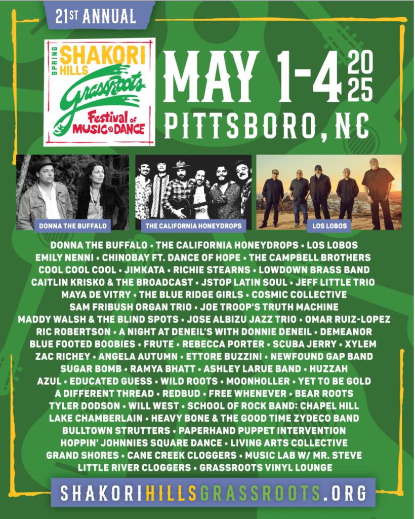 The 20th annual Spring Shakori Hills GrassRoots Festival of Music & Dance returns May 2-5, 2024, in Pittsboro, North Carolina. Featuring performances from hosts Donna The Buffalo, Scythian, Watchhouse, Sarah Shook and the Disarmers, Time Sawyer, The Shoaldiggers and more than 50 other musical acts along with camping, yoga, food trucks, artisans, sustainability workshops, healing arts, kids areas and so much more.
