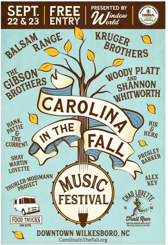 From the good folks at Carolina in the Fall: Carolina in the Fall returns for our seventh festival in the Carolina West Community Commons in Downtown Wilkesboro, North Carolina, with our host band, The Kruger Brothers, for two days of great music, food, drink and community.